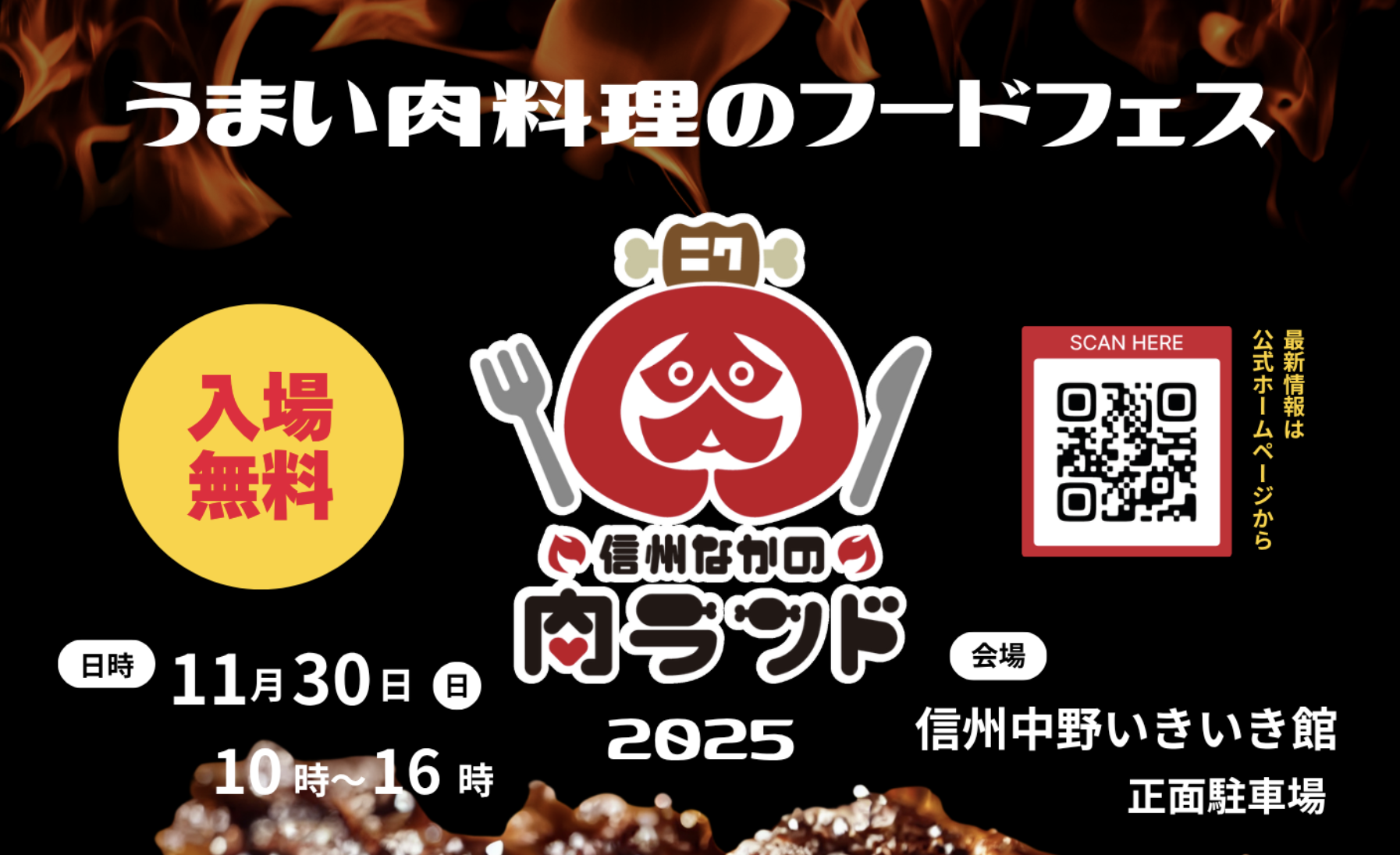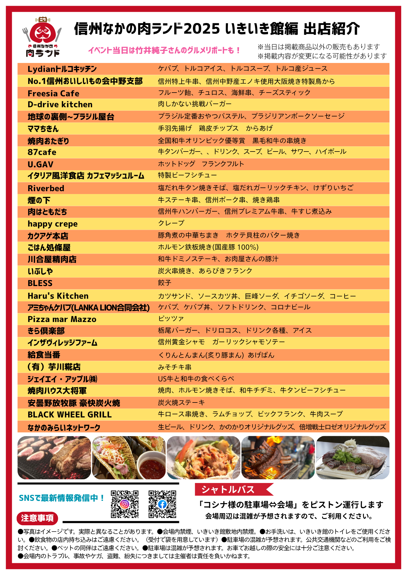 11/30 いきいき館編の出店者が決まりました! 2025 11/18 未分類 2025年11月18日 目次肉ランド最大の31店が大集合!! 今月30日に開催される「信州なかの肉ランド2025」いきいき館編の出店者が決定いたしました。肉グルメを中心に全31店舗が集まります!熱々の肉グルメでお腹もいっぱい、元気もいっぱいにしましょう。 未分類 よかったらシェアしてね! URLをコピーしました! URLをコピーしました! 信州なかの肉ランド2025 開催日決定しました 関連記事関連する記事はまだ見つかりませんでした。